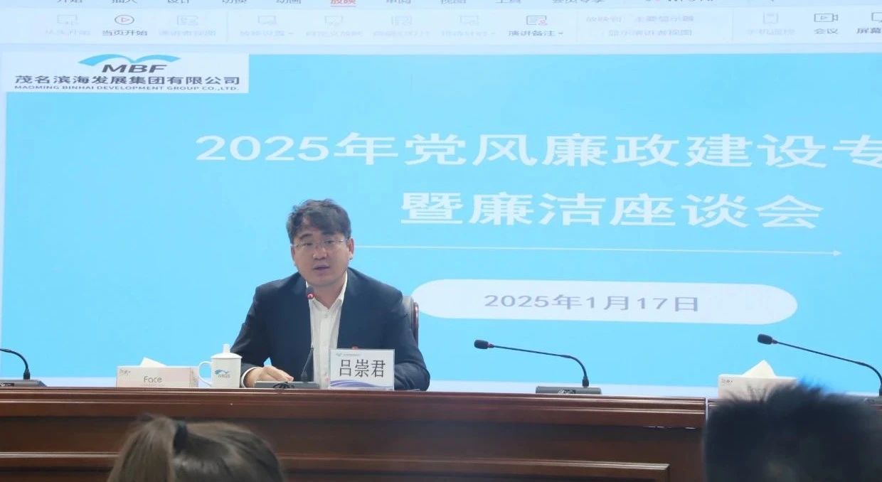 2025年1月17日下午,茂名濱海發展集團(簡稱集團)召開黨風廉政建設專題會暨廉潔座談會,旨在進一步加強新時代國有企業廉潔文化建設,推動集團高質量發展。集團黨委書記、董事長呂崇君做集體廉潔談話,集團黨委委員、總裁李滔主持會議。