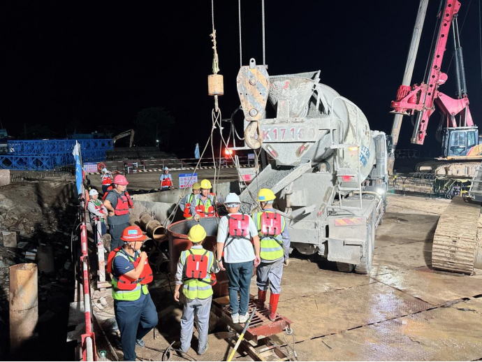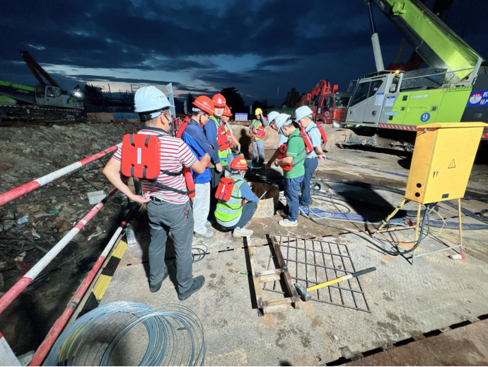 在施工現(xiàn)場(chǎng),建設(shè)團(tuán)隊(duì)嚴(yán)格依照標(biāo)準(zhǔn)化施工流程推進(jìn)作業(yè)。從施打鋼護(hù)筒筑牢基礎(chǔ)防線,到旋挖機(jī)精準(zhǔn)鉆孔;從初次清孔、鋼筋籠精準(zhǔn)下放,再到安裝導(dǎo)管、二次清孔,直至完成水下混凝土澆筑,每一個(gè)環(huán)節(jié)都經(jīng)過(guò)精密測(cè)算與嚴(yán)格把控。過(guò)程中,建設(shè)單位園區(qū)公司、監(jiān)理單位、施工單位三方組成專(zhuān)項(xiàng)攻堅(jiān)小組,全程駐守現(xiàn)場(chǎng),通過(guò)技術(shù)交底、實(shí)時(shí)監(jiān)測(cè)、動(dòng)態(tài)調(diào)整,全力確保澆筑過(guò)程萬(wàn)無(wú)一失。