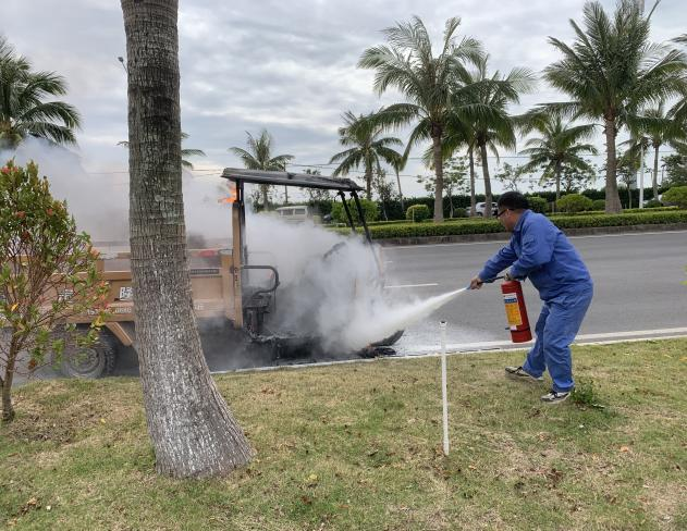 接到通知后,廠區負責人及值班同事迅速響應,攜帶滅火器奔赴現場展開救援。程廷標與同事們配合默契,嚴格按照消防操作規程,熟練操作滅火器對準火源根部進行精準撲救。得益于日常扎實的演練積累,整個滅火過程高效有序,明火在短時間內被徹底撲滅,有效遏制了事故進一步擴大,保障了博賀灣大道的交通順暢及周邊群眾的生命財產安全。